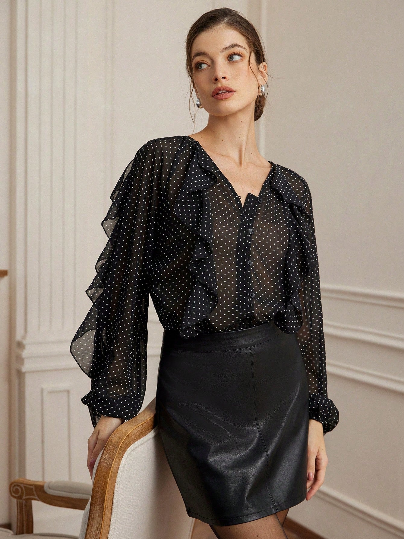 Elegant Vintage Polka Dot Textured Chiffon Ruffle Puff Sleeve Loose Blouse