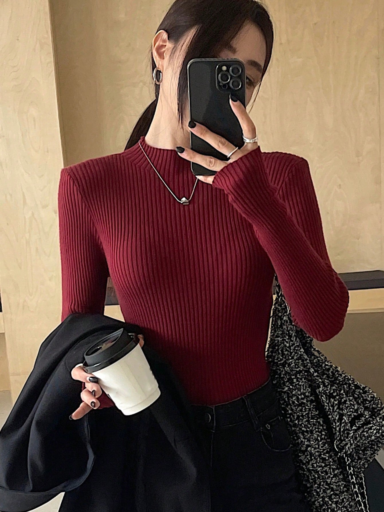 Solid Color Stand Collar Rib-Knit Fitted Women Long Sleeve Sweater