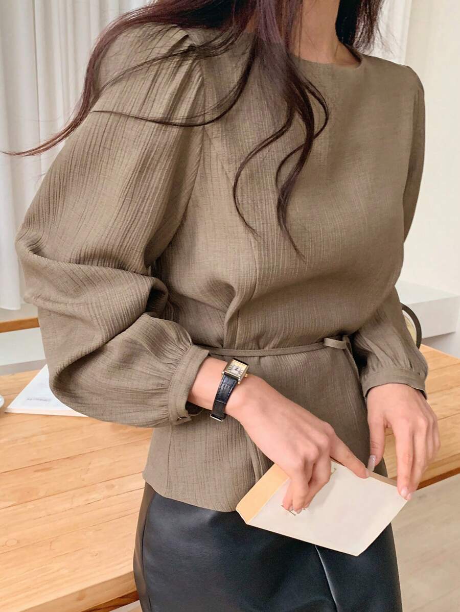 Women's Solid Color Round Neck Puff Sleeve Commuter Shirt
