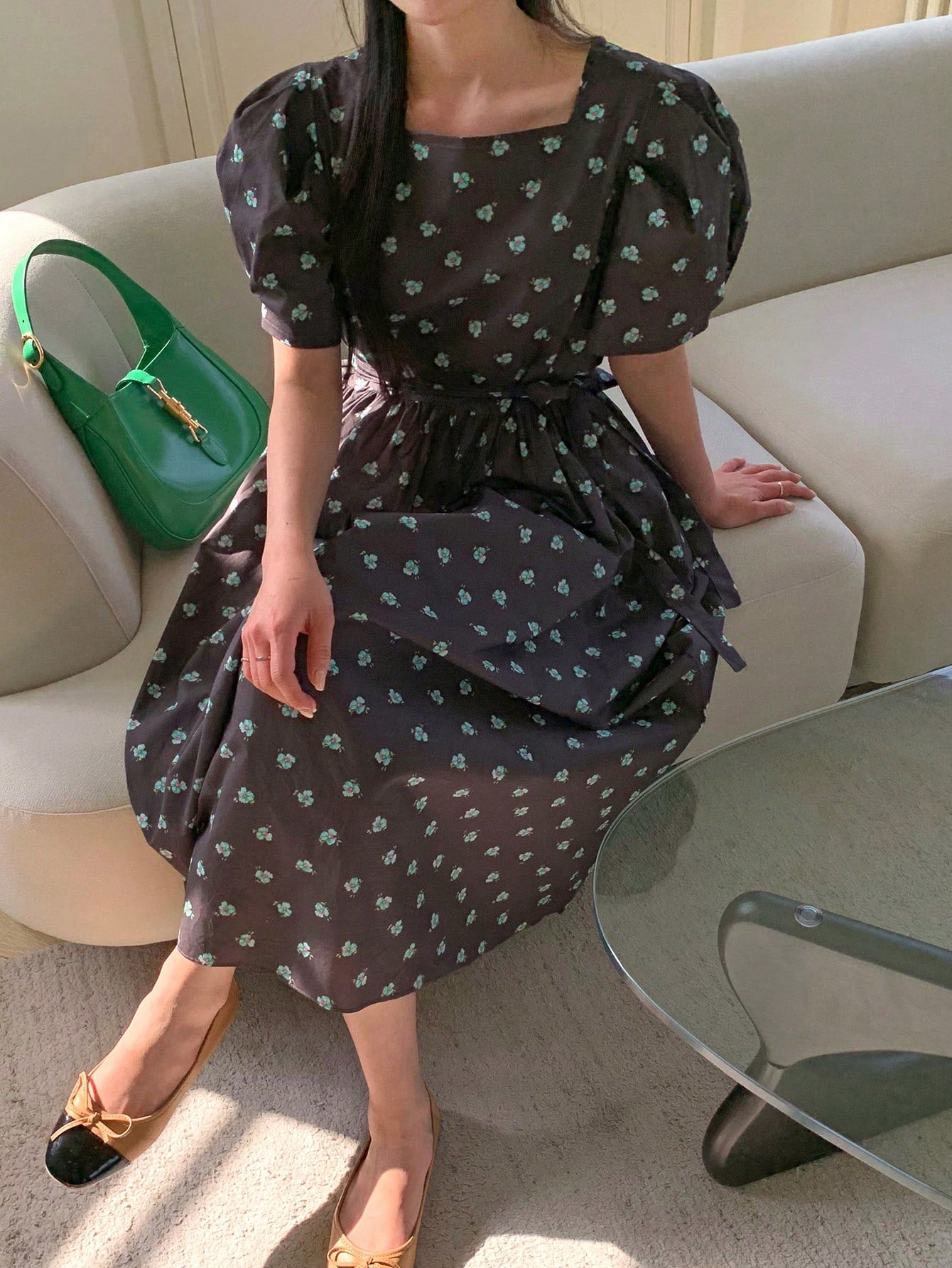 Women's Square Neck Puff Sleeve Ditsy Floral Waist-Cinched Dress