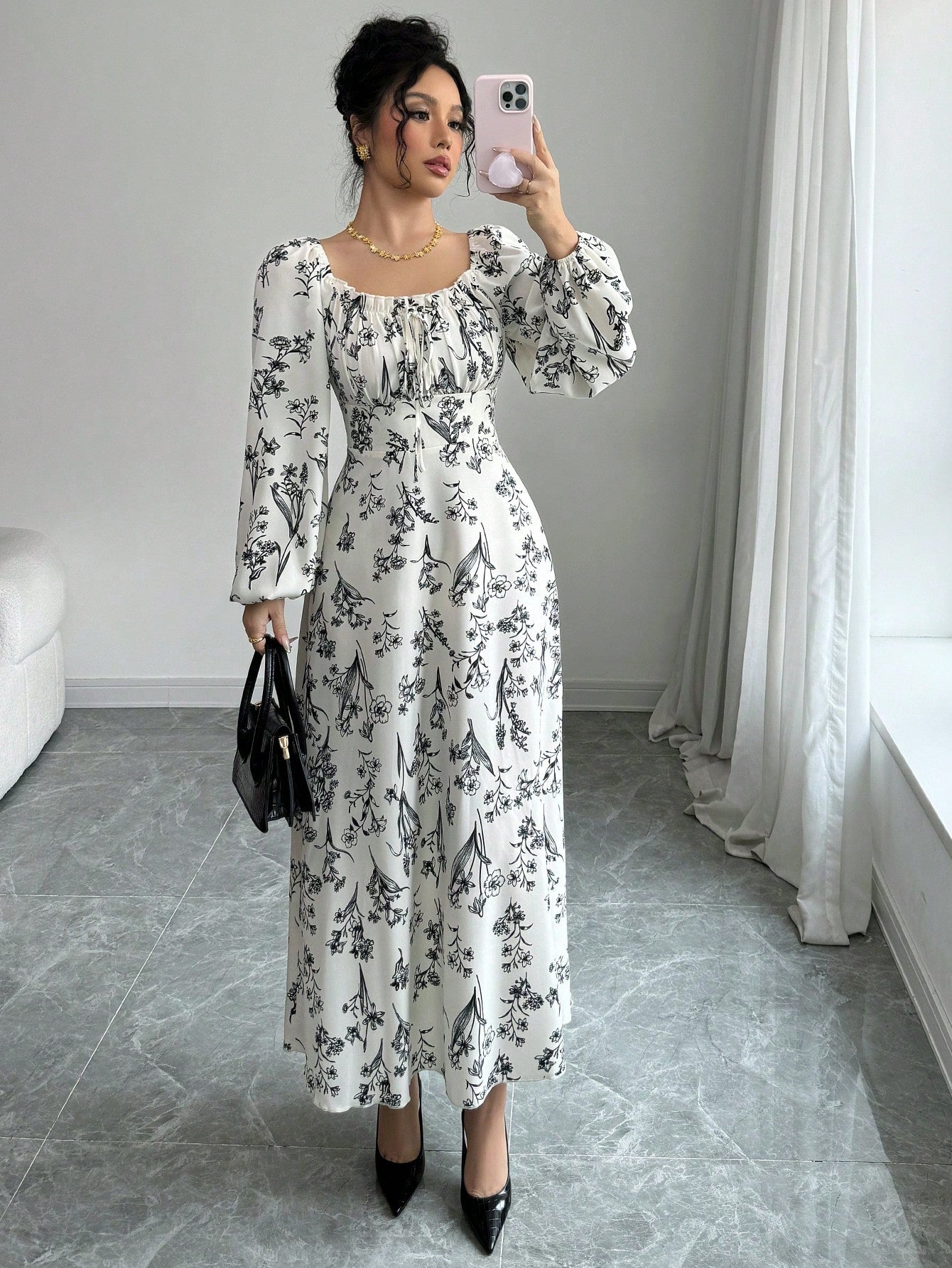 Women's Floral Print Square Collar Lantern Sleeve Elegant Dress