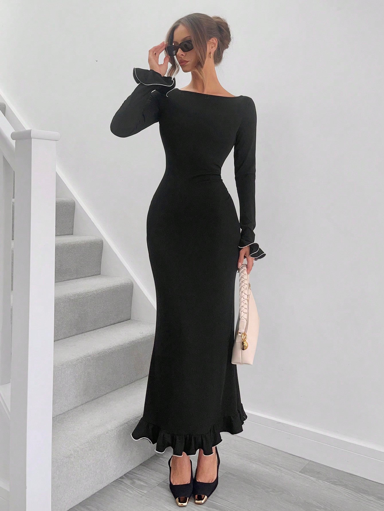Women's Black Round Neck Flare Sleeve Fish-Tail Hem Elegant Dress