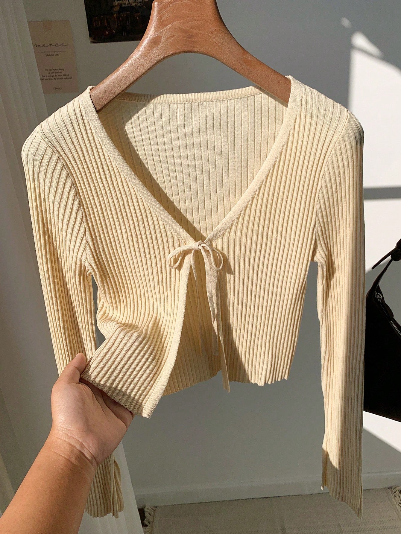 Solid Color Long Sleeve Front Tie Knitted Cardigan
