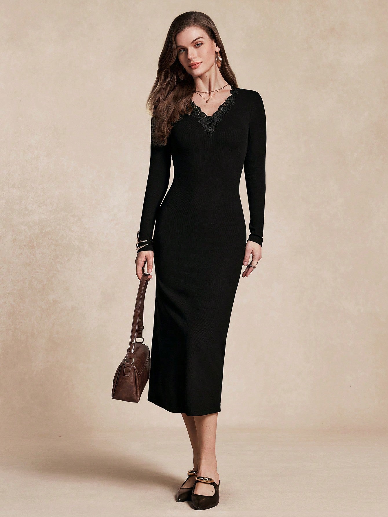 Women's Elegant Collar Flower Solid Color Slim Fit Mid-Length Dress