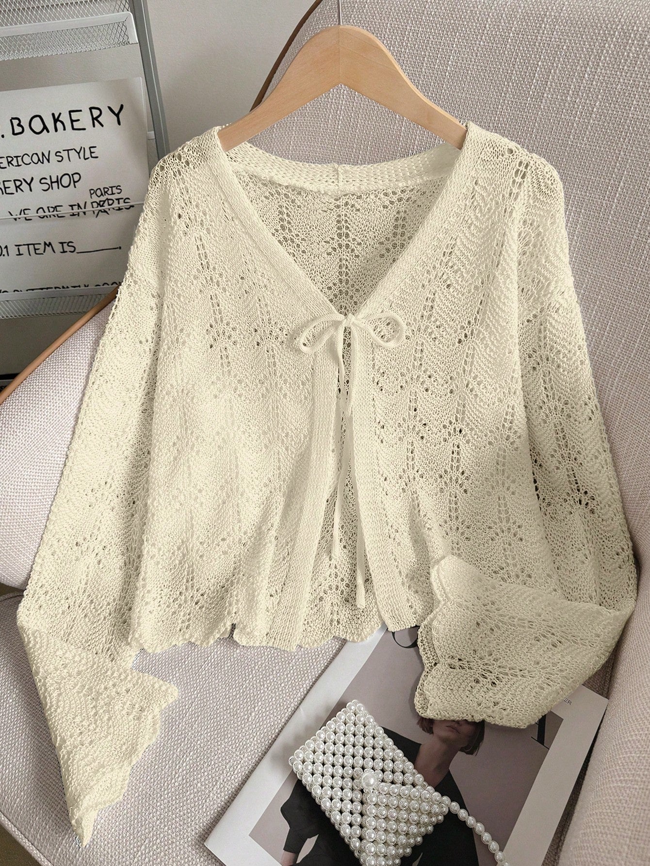 Women's Summer Beach Cover Up Cardigan - Hollow Out Knitwear Top With Bowknot, V-Neck Loose Drop Shoulder Design, Lightweight Vacation Kimono
